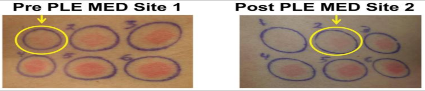(UVB response) Pre -PLE MED site 1 (left), post-PLE MED site 2 (right), is a set of representative clinical photographs demonstrating an increase in MED for a subject from 100 mJ/cm2pre -PLE to 150 mJ/cm2post -PLE administration. Abbreviations: MED, minimal erythema dose; PLE,Polypodium leucotomosextract. Courtesy: J Am Acad Dermatol. 2017 Mar 22;77(1):33–41.e1